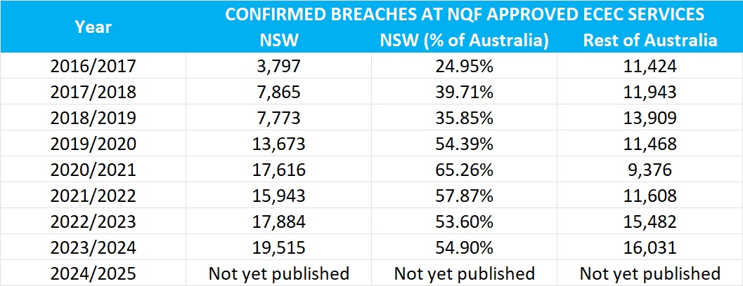 Taking the two sets of data into consideration, especially given the extremely low number of enforcement actions relative to the huge number of breaches (generated) in NSW, thankfully these do not appear to translate to a systemic loss of children's safety.