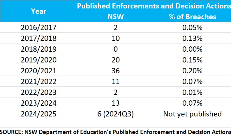 What does not make sense is the starkly low number of prosecutions (ie enforcement actions) that the NSW Department of Education has taken over the same period given NSW's ever-growing number of breaches.